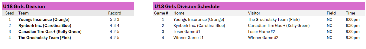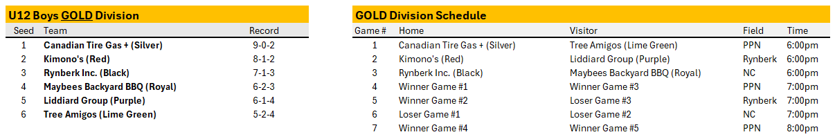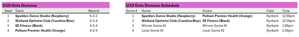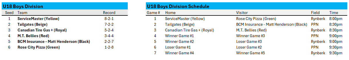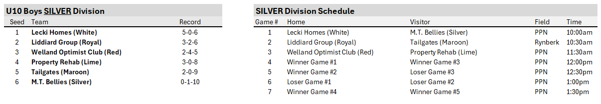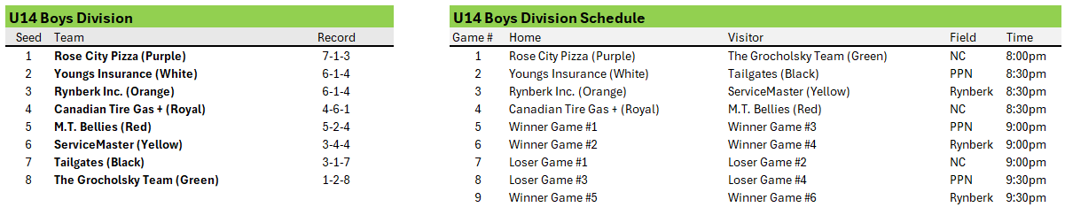 Below are the official playoff brackets for each division. The House League Convenors will instruct the teams when and where they will play their second game once results are in.